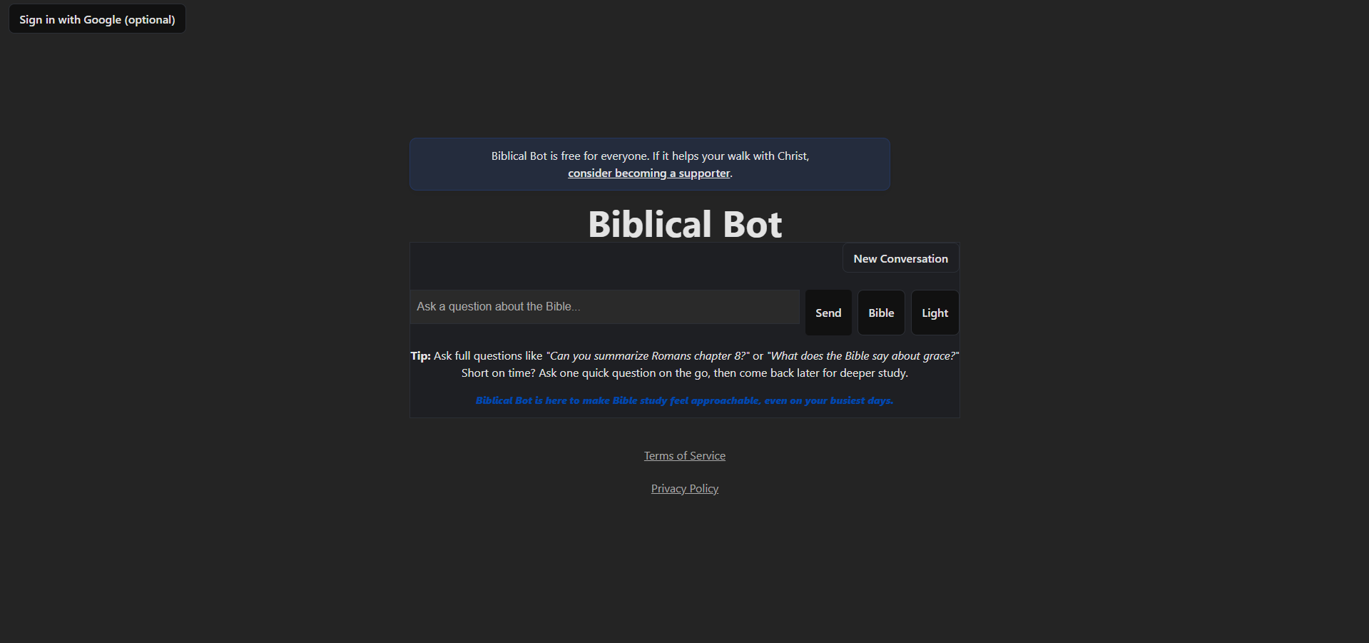 Ask questions, search for verses, or discuss themes — Biblical Bot draws from the World English Bible (WEB) and related commentaries to provide accurate, contextual responses. It also includes a built-in Bible reader, allowing you to browse chapters directly or dive deeper into referenced passages as you chat.